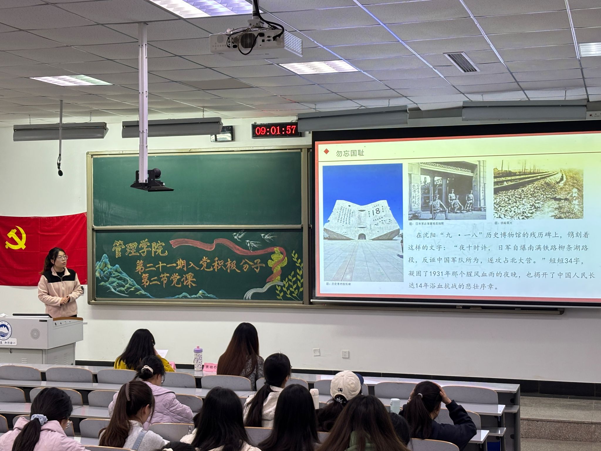 为纪念中国人民抗日战争暨世界反法西斯战争胜利80周年,管理学院党校于10月25日在工学馆126教室举办第二十一期入党积极分子培训班第二次专题党课,本次党课由东大青年说宣讲团成员张钰彤、彭雨、尹艺学进行讲解,引导学员们深刻理解抗战精神的丰富内涵与时代价值,传承红色基因,激发爱国热情与奋斗动力。