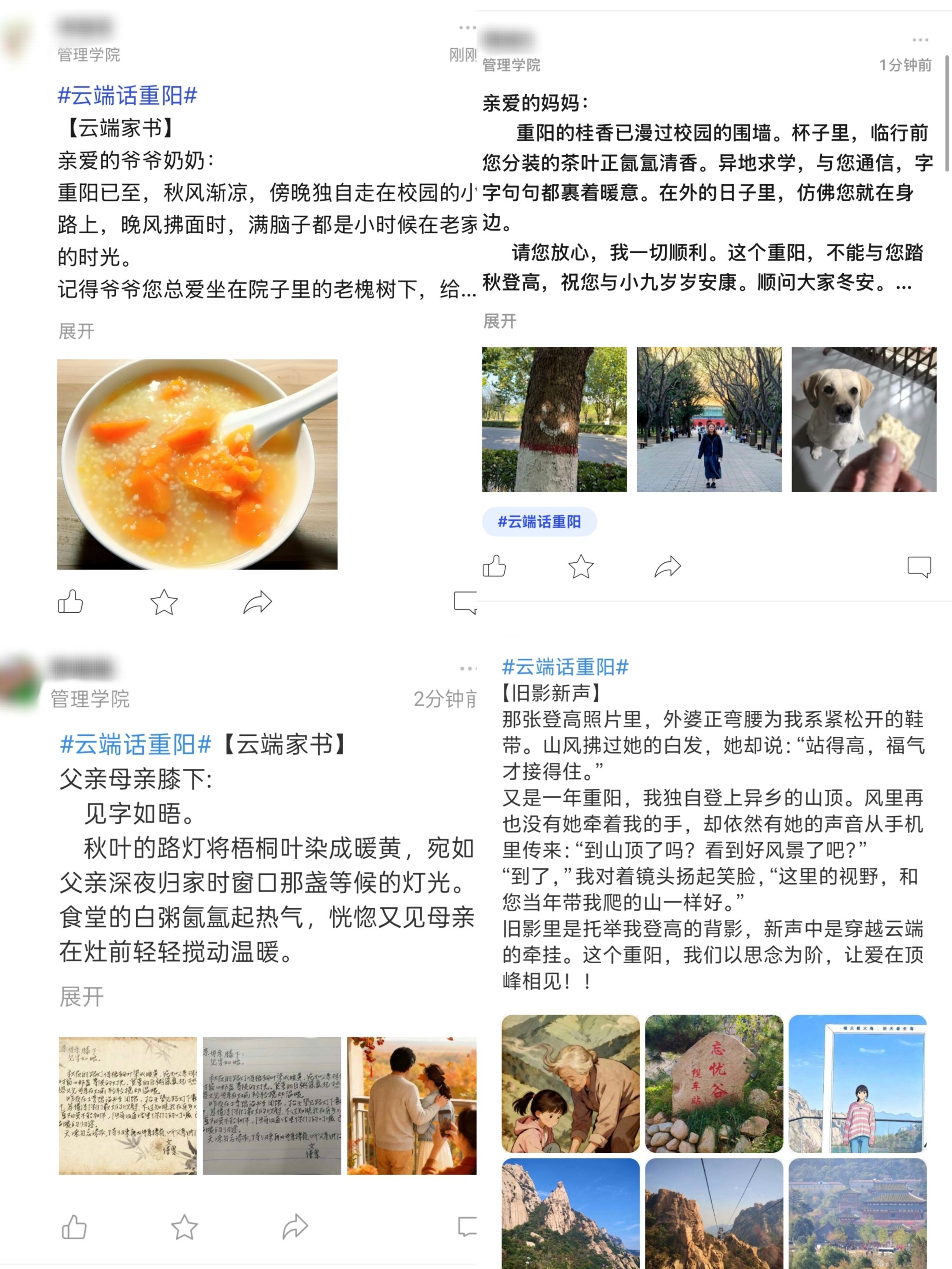 恰逢重阳佳节,为缓解同学们异地求学无法陪伴长辈的遗憾,同时加深对重阳节文化内涵的认知,我院依托今日校园线上平台举办“云端寄相思,重阳暖亲心”重阳节线上特别活动。活动期间,同学们在今日校园平台“云端话重阳”话题下发布打卡内容,通过一封家书寄相思、原创诗词传眷恋、一段故事忆温情等形式,在线上向家中长辈传达自己的思念与祝福。此次活动吸引了学院众多同学参与,大家以图文形式分享了与长辈的过往故事或自身校园生活,表达了对亲情的眷恋、对传统美德的思考。