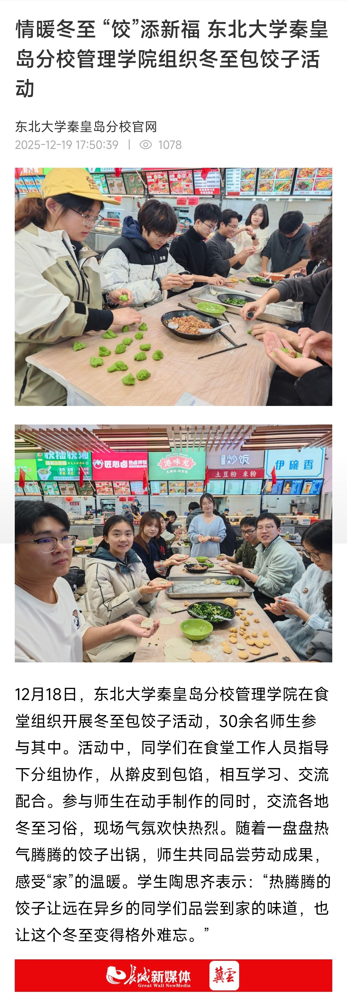 冬至时节,寒意虽浓,学校食堂内却洋溢着融融暖意。12月18日下午,管理学院在校内食堂组织开展冬至包饺子活动,活动吸引30余名师生参与,大家在冬至这个特殊的日子里,共同感受传统节日的独特魅力与校园生活的温馨。
