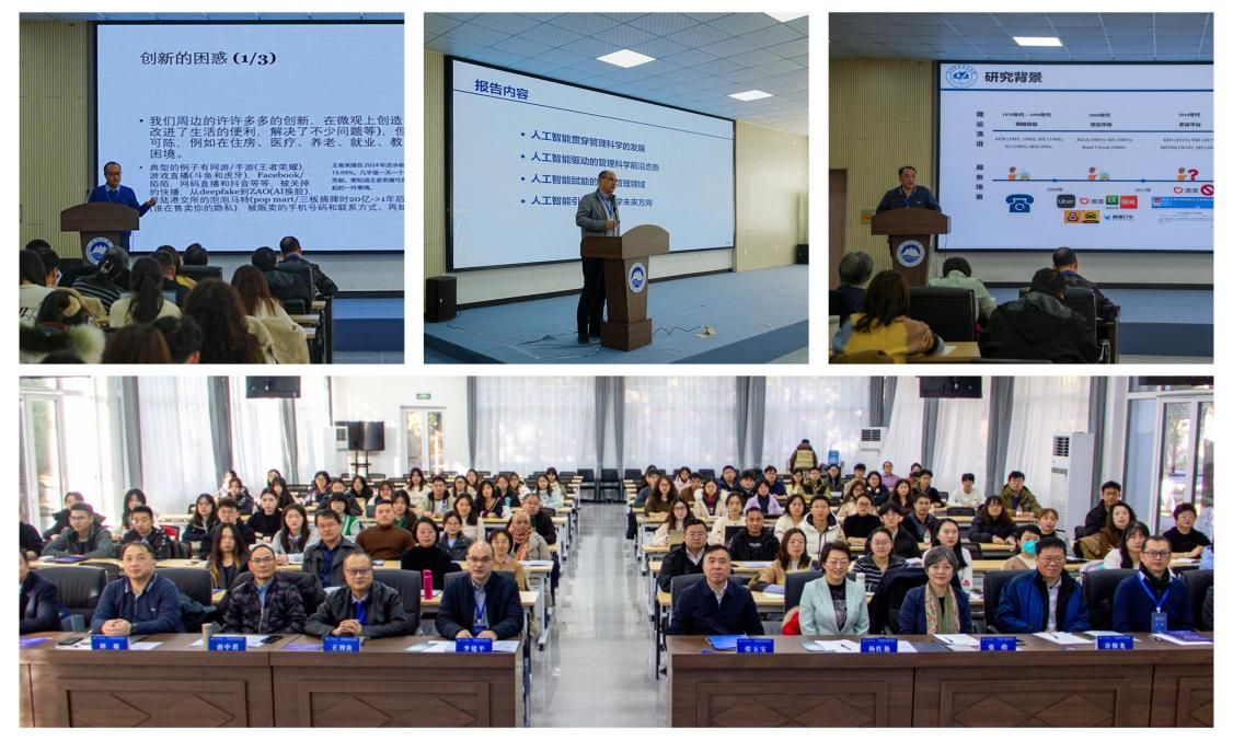 在随后进行的主旨报告环节,北京航空航天大学田琼教授以数智出行平台为研究对象,探讨了AI赋能下的管理决策优化与可持续组织转型路径,提出了创新的两阶段模型与高效求解算法。中国人民大学王刊良教授从AI时代的技术扩散现实出发,剖析了创新过程中的困惑与悖论,并对科技向善、商业伦理等议题进行了深刻反思。中国科学院大学李建平教授系统梳理了人工智能驱动的管理学科前沿态势,指出AI已贯穿管理科学多个经典领域,并正引领研究范式从“用AI解决问题”到“向AI学习理论”的根本性转移。